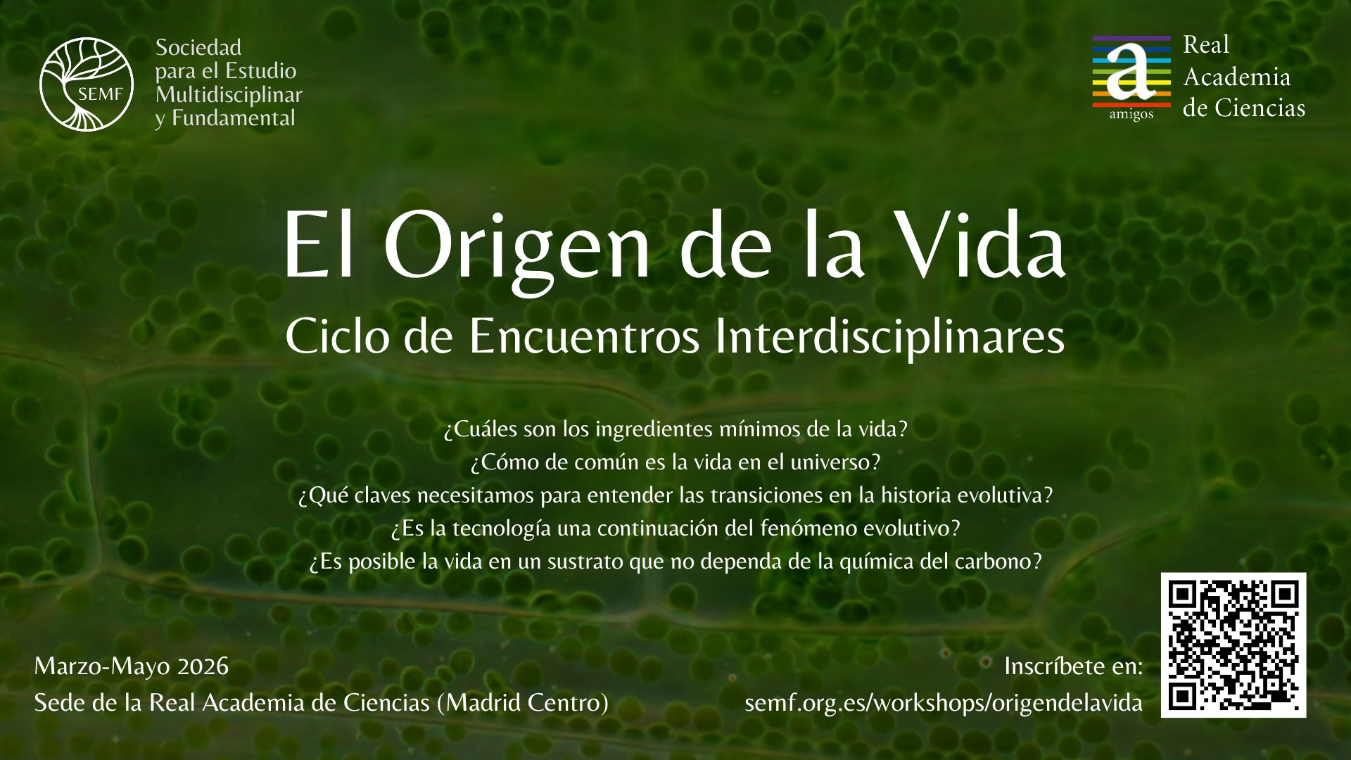 Organizados por la Sociedad para el Estudio Multidisciplinar y Fundamental con el apoyo de Amigos de la Real Academia de Ciencias, cada encuentro contará con la presencia de varios ponentes que ofrecerán su perspectiva y la relación de su trabajo de investigación con el problema del origen de la vida. Además, se moderará un debate conjunto con las personas asistentes en el que se buscarán puntos de encuentro y posibles colaboraciones. Al terminar existirá la posibilidad de continuar con las conversaciones entre ponentes y participantes en un contexto distendido.