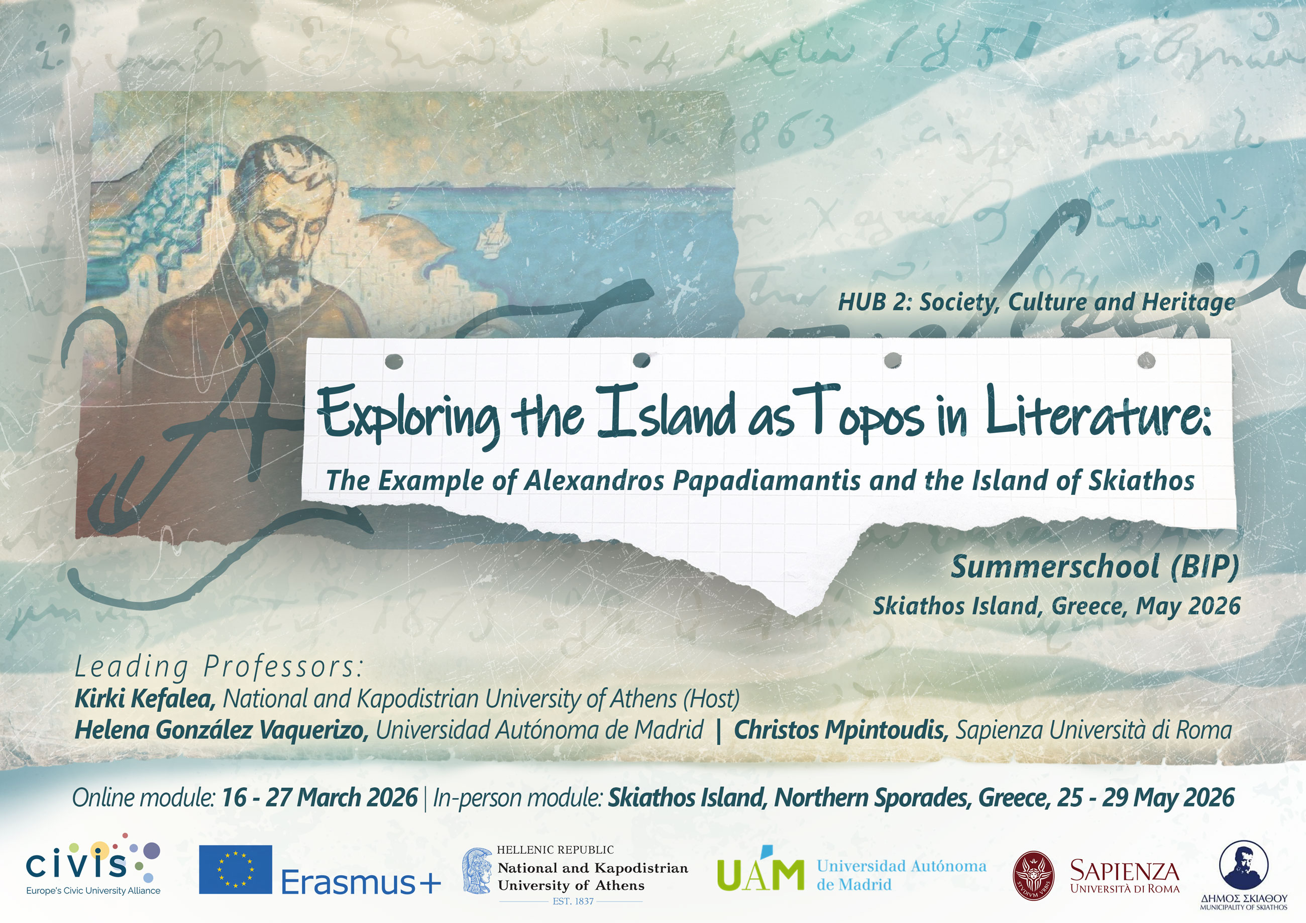 CIVIS-BIP: "Exploring the Island as a Topos in Literature. The Example of Alexandros Papadiamantis and Island of Skiathos". Módulo online: 16-27 de marzo de 2026. Módulo presencial: 25-29 de mayo de 2026 (Skiathos). Matrícula: hasta el 30 de octubre de 2025. Organizan: Kirki Kefalea (Universidad Nacional Kapodistria de Atenas), Christos Bontoudis (Universidad La Sapienza de Roma) y Helena González Vaquerizo (Universidad Autónoma de Madrid). Enlace https://civis.eu/en/learn/civis-courses/exploring-the-island-as-topos-in-literature-the-example-of-alexandros-papadiamantis-and-the-island-of-skiathos