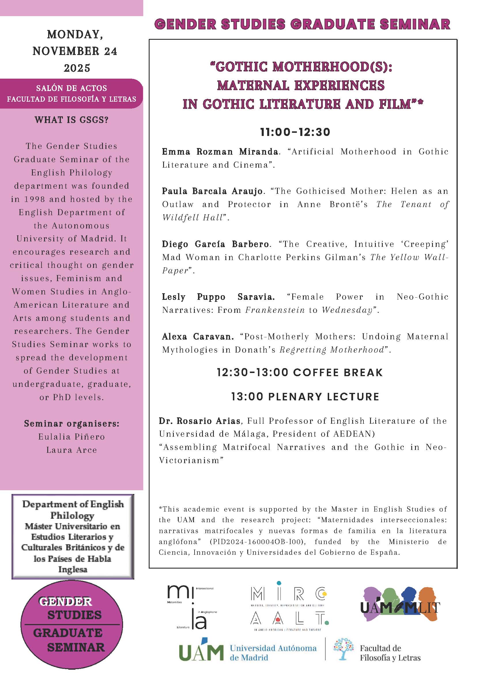 The Gender Studies Graduate Seminar of the English Philology department was founded in 1998 and hosted by the English Department of the Autonomous University of Madrid. It encourages research and critical thought on gender issues, Feminism and Women Studies in Anglo-American Literature and Arts among students and researchers. The Gender Studies Seminar works to spread the development of Gender Studies at underdraduate, graduate, or PhD levels.