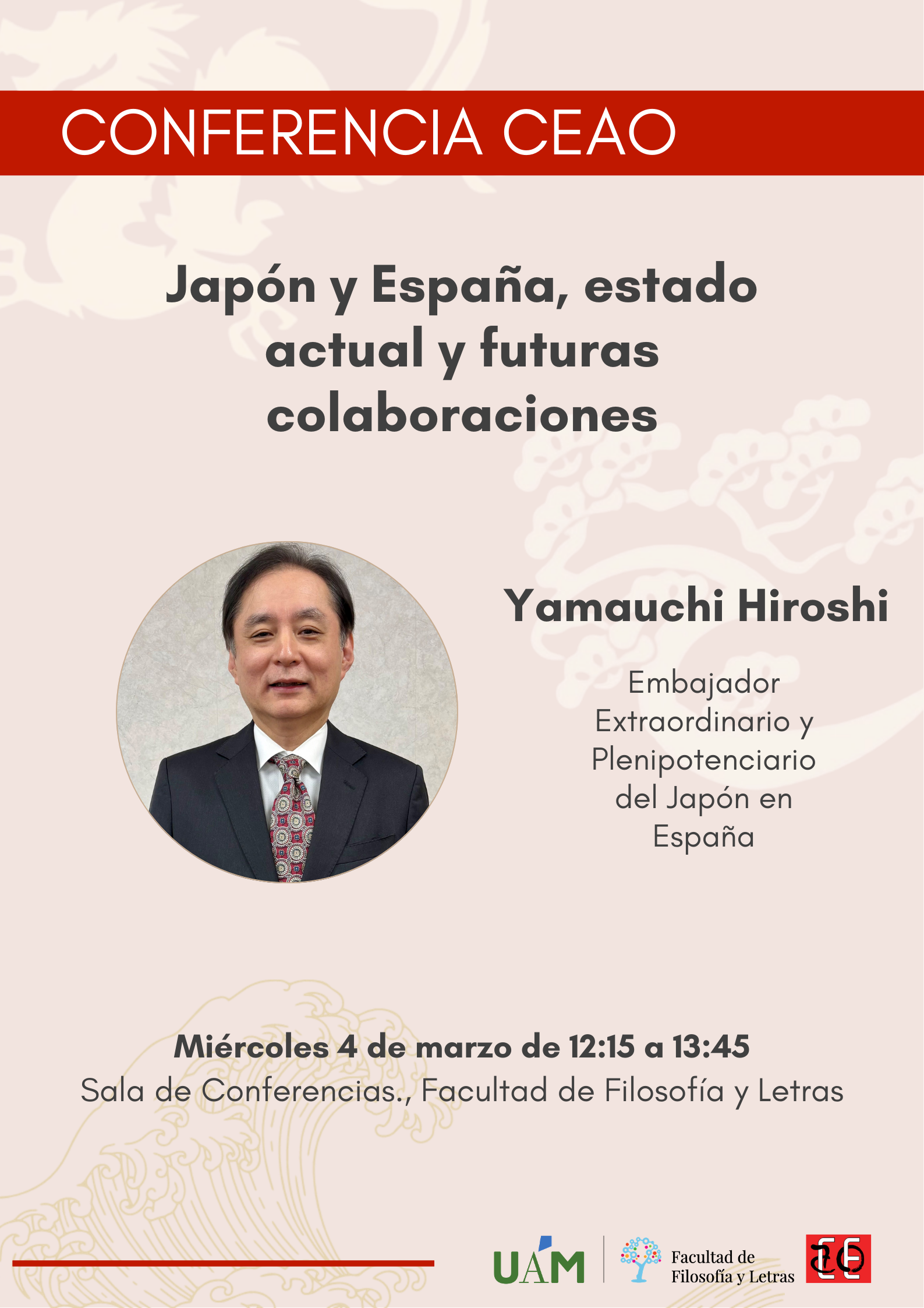 El día miércoles 4 de marzo, tendrá lugar una conferencia sobre las relaciones y futuras colaboraciones entre Japón y España a cargo del Sr. Yamauchi Hiroshi, Embajador Extraordinario y Plenipotenciario del Japón en España.