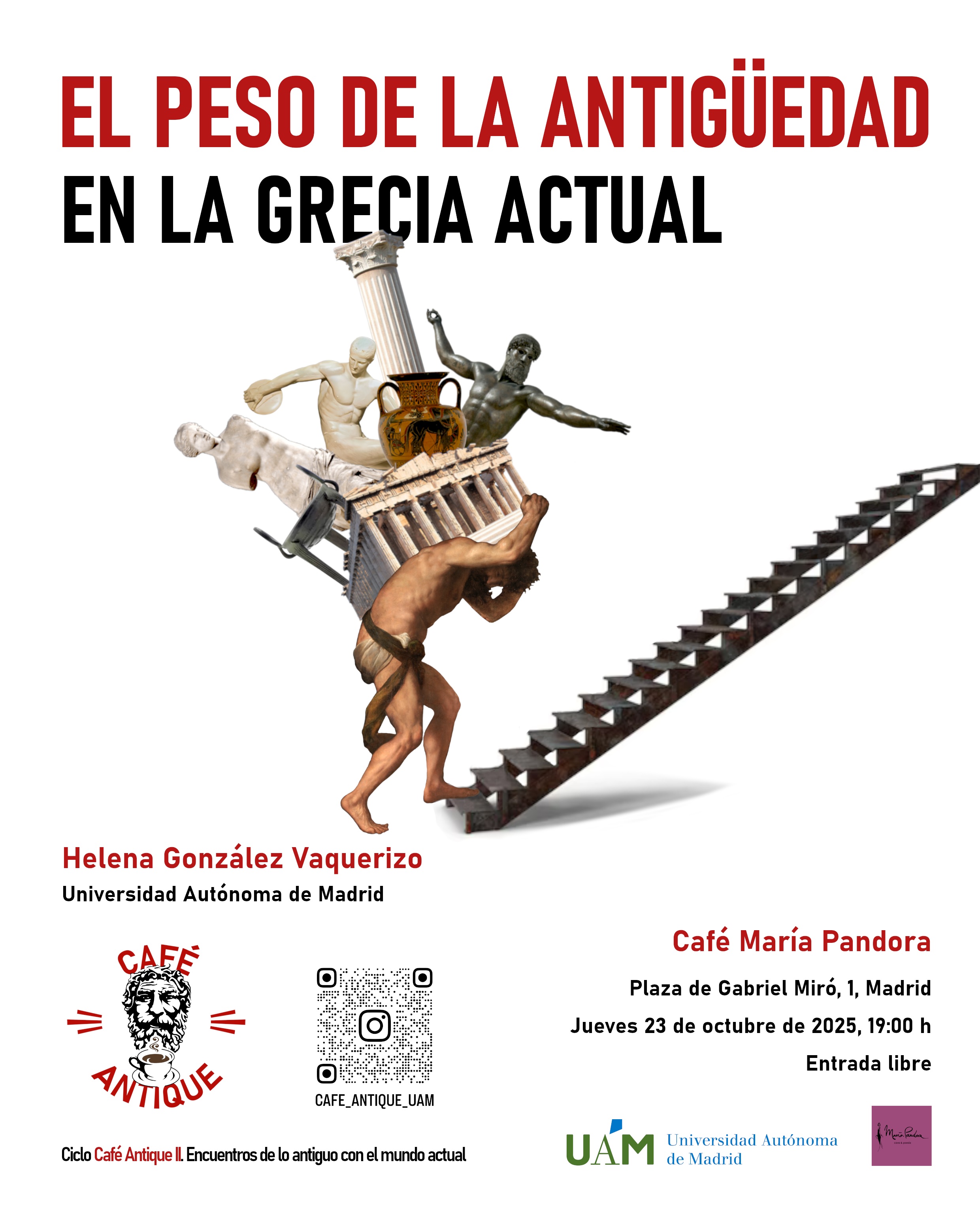Evento jueves 23 de octubre a las 19:00. Título: "El peso de la Antigüedad en la Grecia actual". Ponente: Helena González Vaquerizo. Lugar: Café María Pandora. Organiza: Tomás Aguilera Durán (Café Antique II).