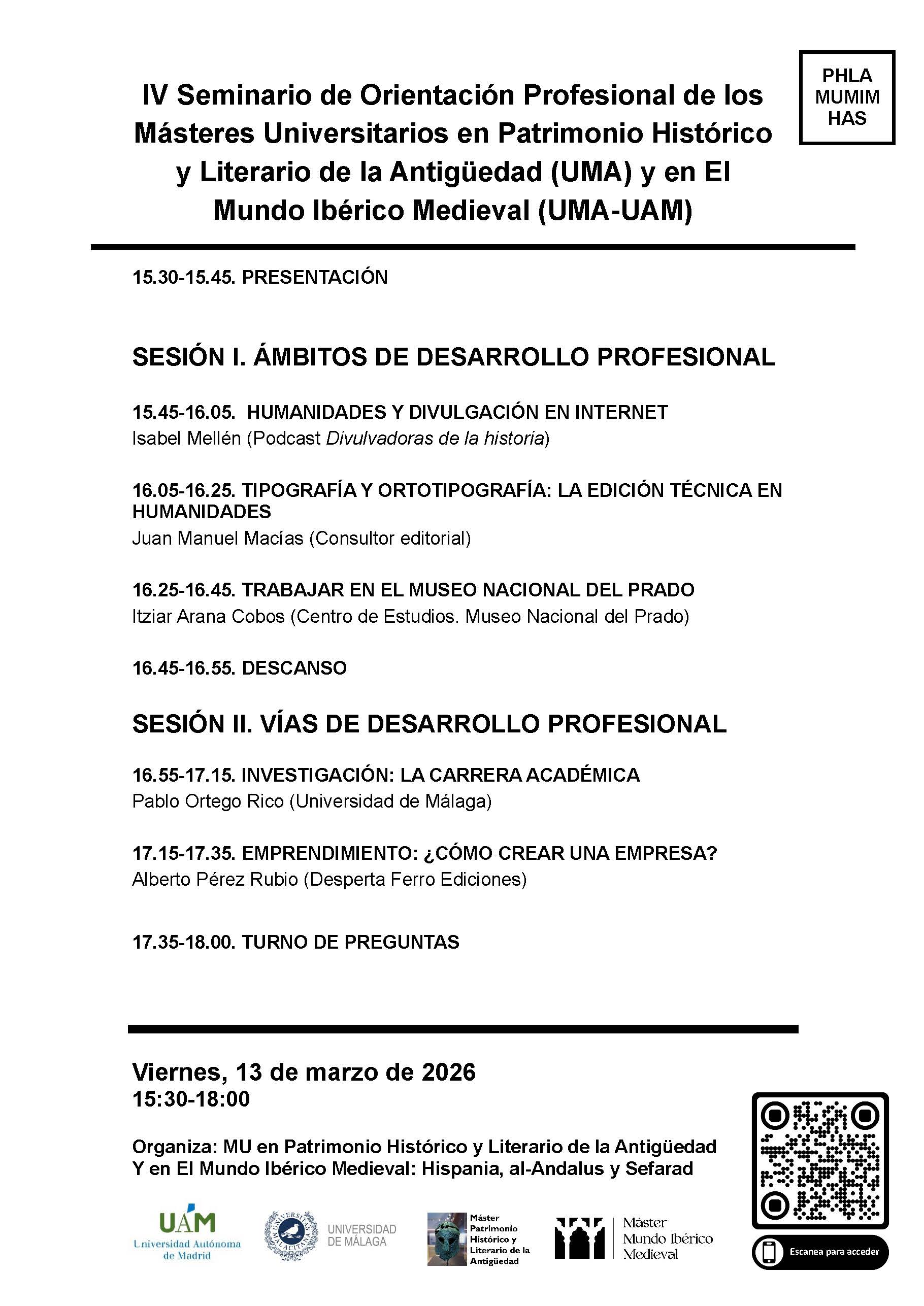 IV Seminario de Orientación Profesional de los Másteres Universitarios en Patrimonio Histórico y Literario de la Antigüedad (UMA) y en El Mundo Ibérico Medieval (UMA-UAM)