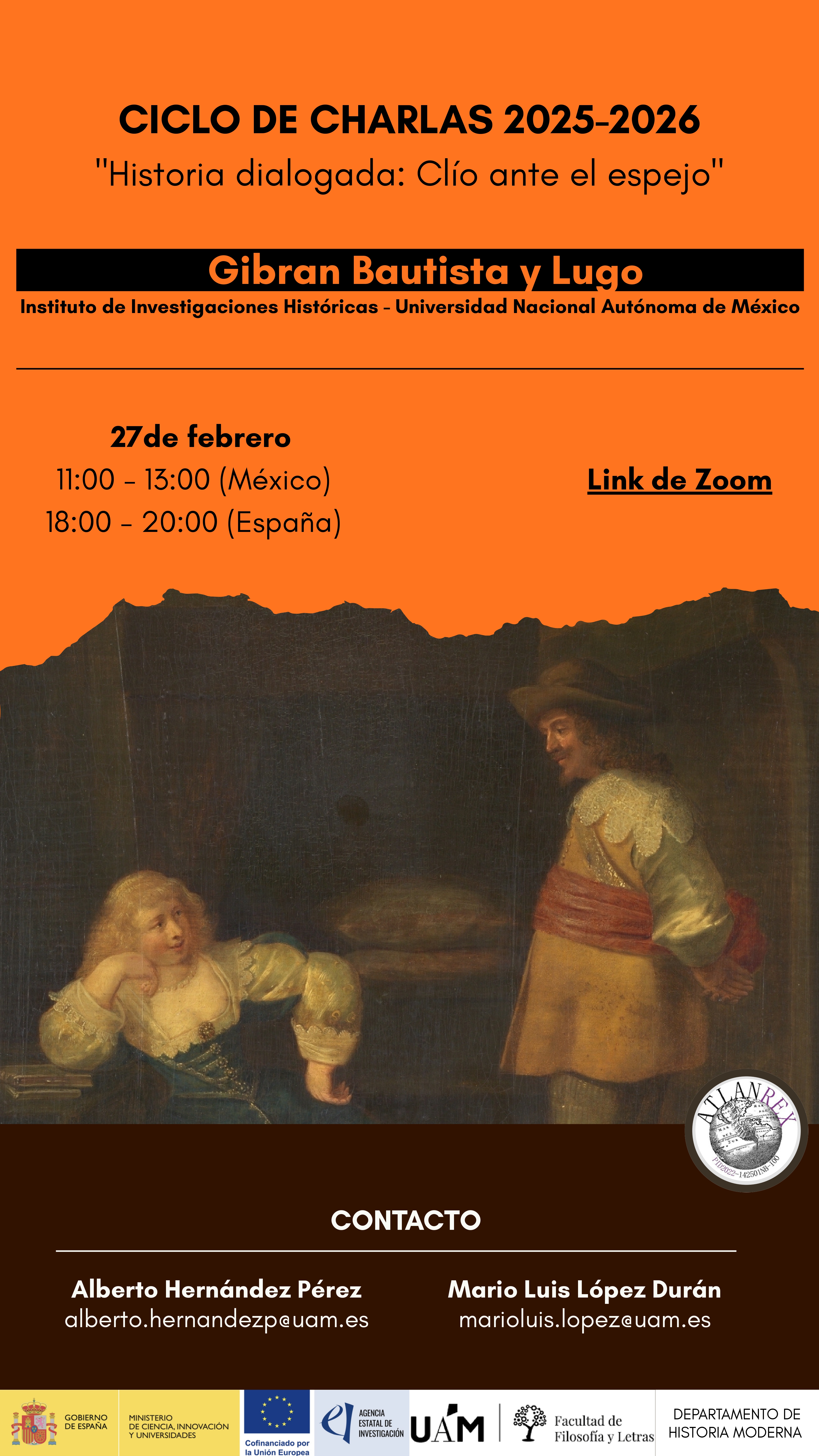 Nos complace anunciar la celebración de la 13ª sesión de la II Edición del Ciclo de Charlas «Historia Dialogada: Clío ante el espejo» donde contaremos con la participación de Gibran Bautista y Lugo (Instituto de Investigaciones Históricas/Universidad Nacional Autónoma de México).La sesión tendrá lugar el viernes, 27 de febrero, entre las 18:00-20:00 horas (Madrid) y las 11:00-13:00 (México). Se podrá seguir exclusivamente a través de Zoom: https://us06web.zoom.us/j/86799978039.