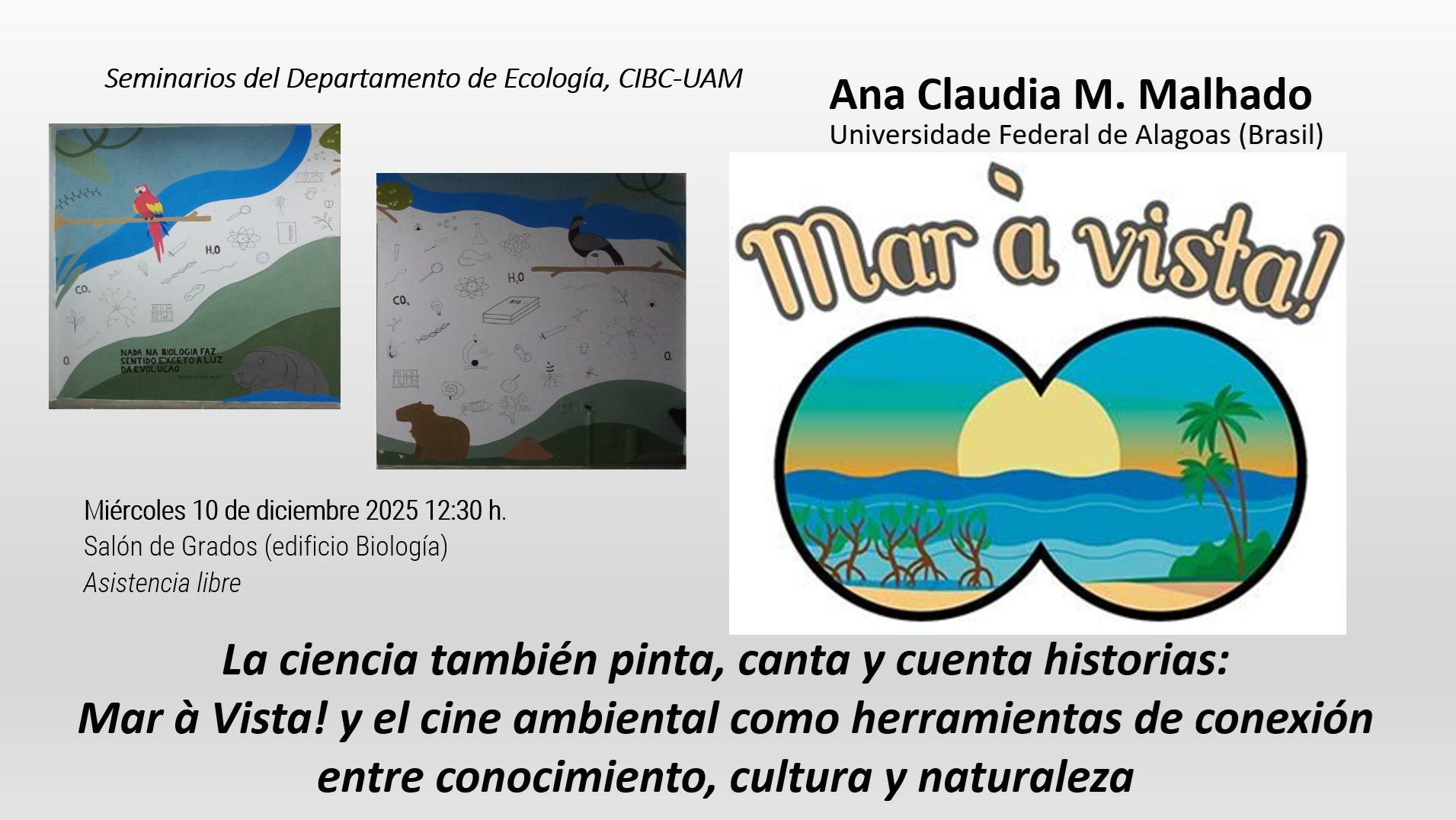 En esta charla, exploraremos como la Ecología puede expresarse a través del arte, la cultura y el cine para acercar el conocimiento ambiental a las personas. A partir del proyecto Mar à Vista!, reflexionaremos sobre el papel del cine ambiental como herramienta de extensión universitaria, sensibilización y conexión emocional con la naturaleza y el mar.