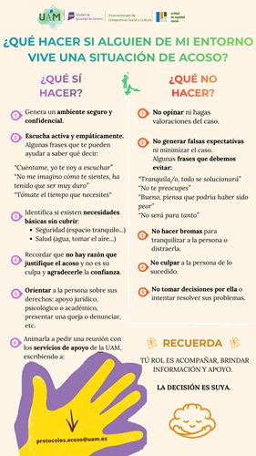 Si ves a una persona que está sufriendo acoso, puedes ayudar. Infórmate sobre los protocolos de la UAM, y anímala a escribir a protocolos.acoso@uam.es. Si lo consideras necesario, contacta tú también. Lo más importante, es escuchar, acompañar, no juzgar y transmitir a esa persona no está sola. |