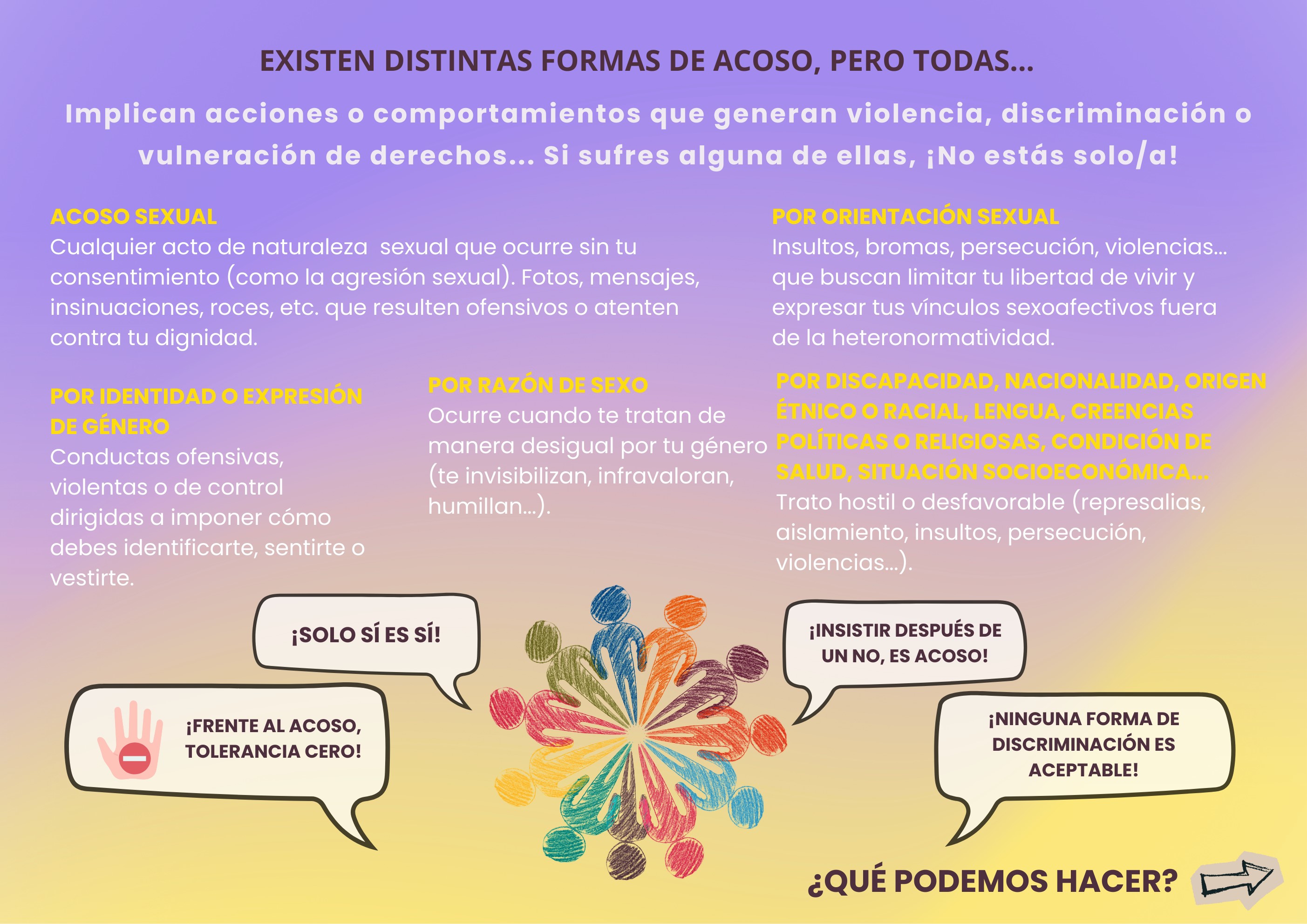 Si tú, o alguna persona de tu entorno, está viviendo una situación de acoso sexual, sexista, LGTBIAQ+fóbico, racista, o conductas, comentarios o gestos ofensivos por tu religión, opinión política, edad, discapacidad, enfermedad, condición socioeconómica, lingüística, apariencia, o cualquier otra circunstancia personal, en ese caso, no dudes en escribir a: