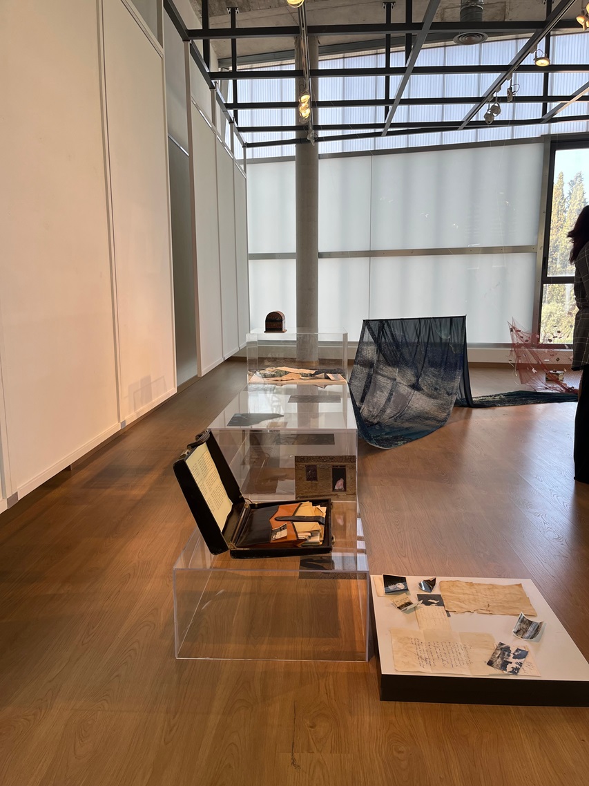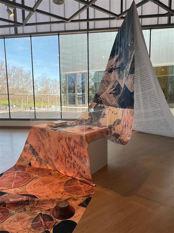 Entre las obras presentadas destaca una gran tela continua que atraviesa el espacio expositivo, intervenida con fotografías, textos, dibujos y bordados, configurando una particular pintura de paisaje. Junto a esta pieza, mapas, postales y elementos sonoros se distribuyen por la sala, proponiendo formas alternativas de narrar y habitar el territorio más allá de la imagen y la escritura.