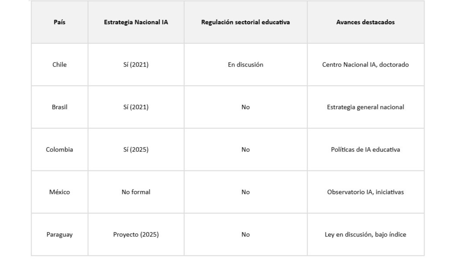 A la fecha, América Latina carece de un marco regulatorio unificado sobre IA en educación superior. Chile lidera con una Política Nacional de IA desde 2021 y una ley en discusión, mientras que países como Brasil y Colombia han avanzado en estrategias nacionales, pero sin una regulación sectorial específica para el campo educativo. En la mayoría de los países, las universidades operan en un vacío normativo, tomando decisiones aisladas sobre el uso de IA.