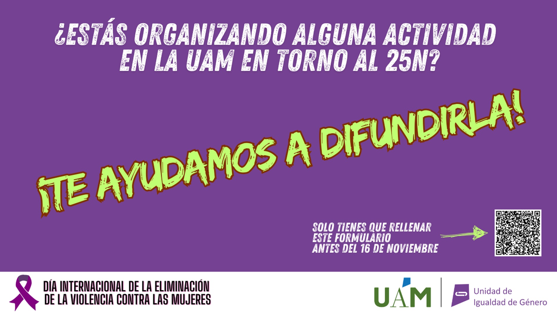 Como cada año, desde la Unidad de Igualdad de Género estamos recopilando las actividades que se van a celebrar en torno al 25 de noviembre (Día Internacional de la Eliminación de la Violencia contra las Mujeres) en el ámbito de la UAM y de los centros del CSIC ubicados en el campus de Cantoblanco. En este formulario puedes registrar, hasta el 16 de noviembre, aquellas actividades que estés organizando o coordinando para incluirlas en el Calendario de Actividades de la UAM del 25N.