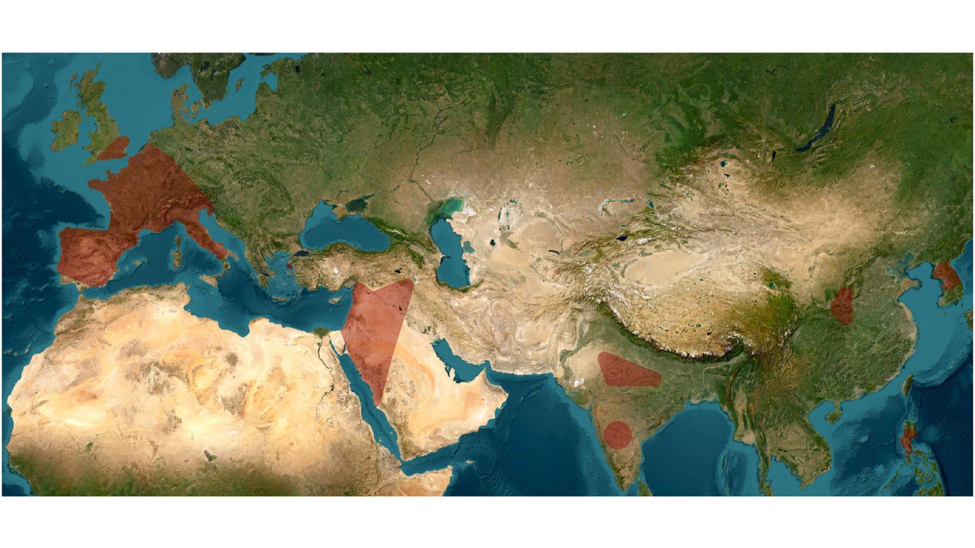 Análisis detallado de los últimos hallazgos de bifaces achelenses, con especial atención a Eurasia, entre 0,5 y 0,1 millones de años atrás. La distribución geográfica mínima se muestra en rojo, representando las áreas de presencia inferidas a partir de la agrupación de yacimientos arqueológicos bien datados. Se generaron envolventes mediante agrupamiento basado en distancias y reconstrucción de la envolvente cóncava, seguidas de una expansión espacial moderada / Musée de l'Homme