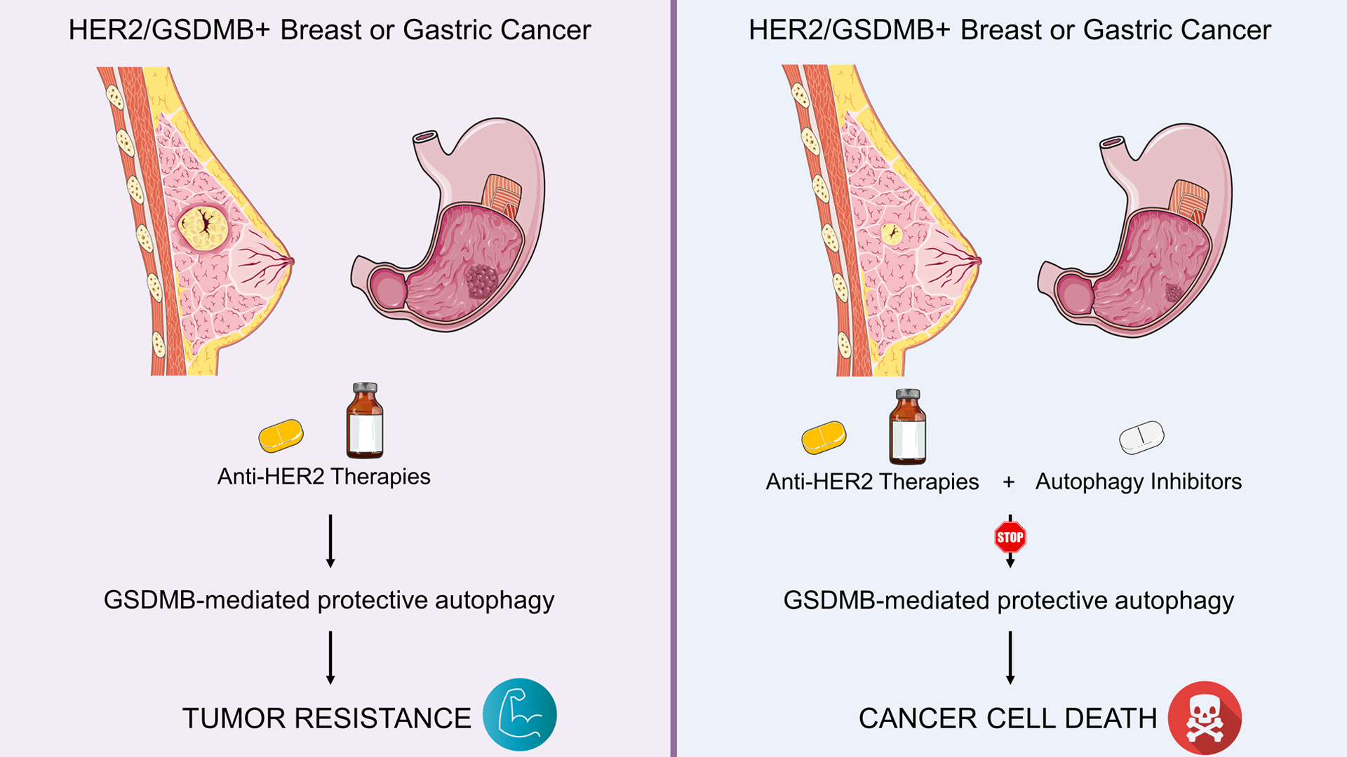 Representación esquemática de la posible pauta de tratamiento en tumores HER2 con expresión o no de Gasdermina B (GSDMB). La combinación de terapias antiHER2 con inhibidores de autofagia podría ser considerada una nueva alternativa terapéutica en tumores HER2/GSDMB de mal pronóstico / G. Moreno Bueno