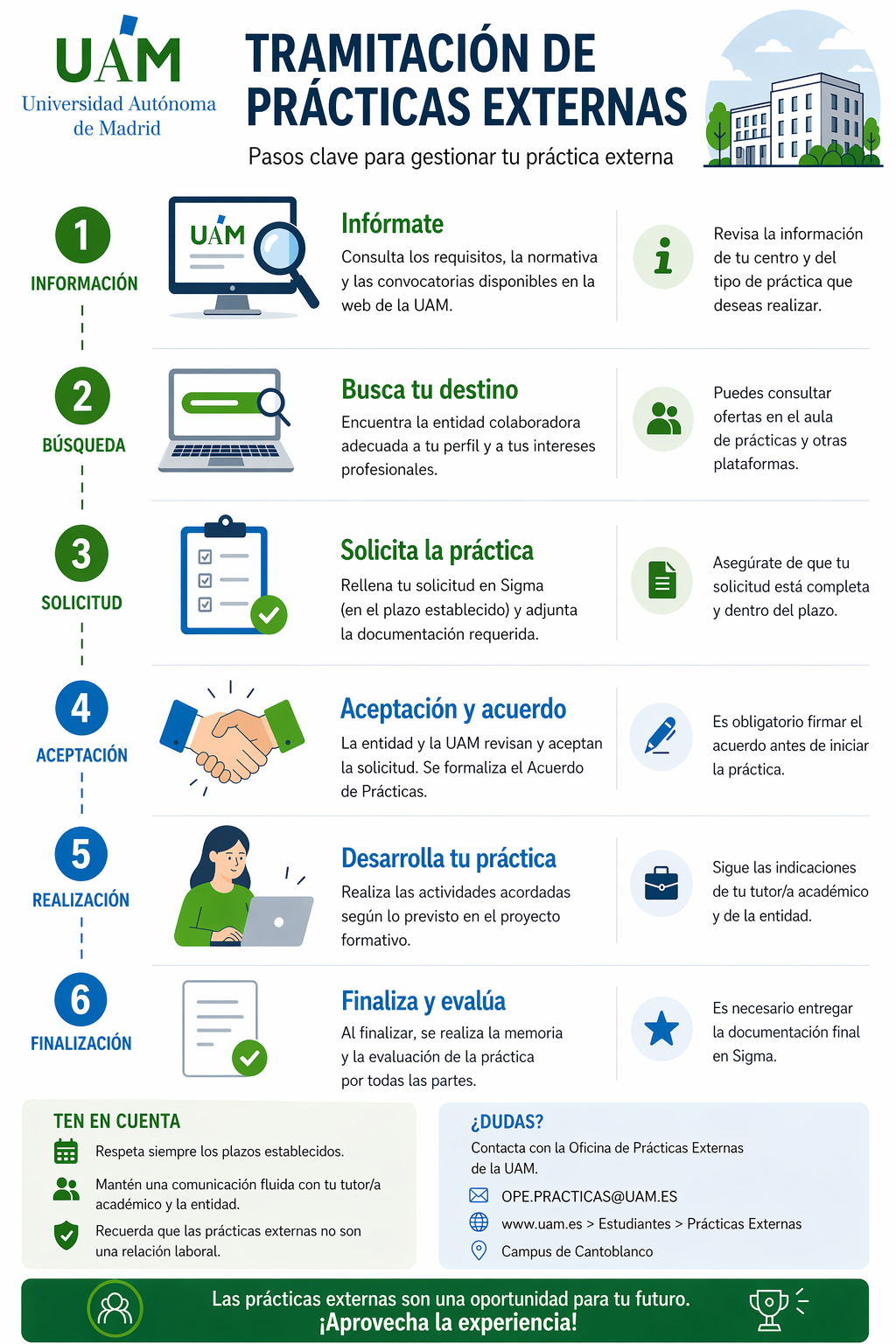La OPE firma el documento en nombre de la UAM. El día de incorporación del estudiante a la entidad se considera el inicio oficial de las prácticas.