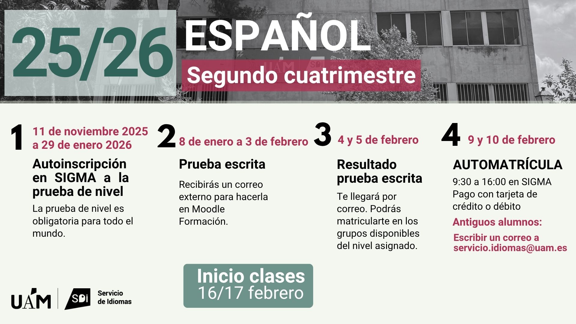 - No necesitas hacer la prueba si has completado un curso durante el primer cuatrimestre del curso 2025/2026. Si es tu caso, envía un correo a servicio.idiomas@uam.es . Fecha límite: 2 de febrero.