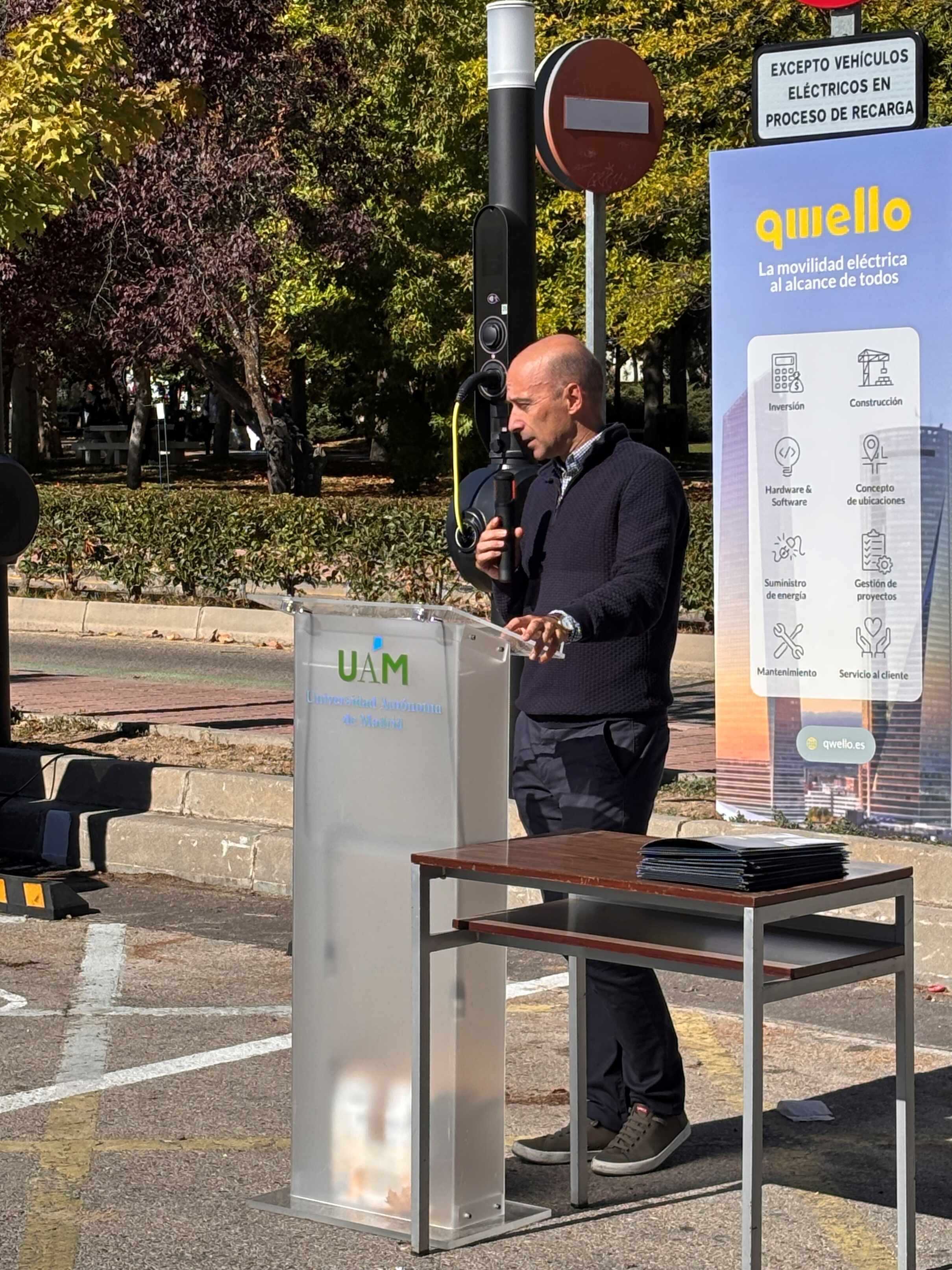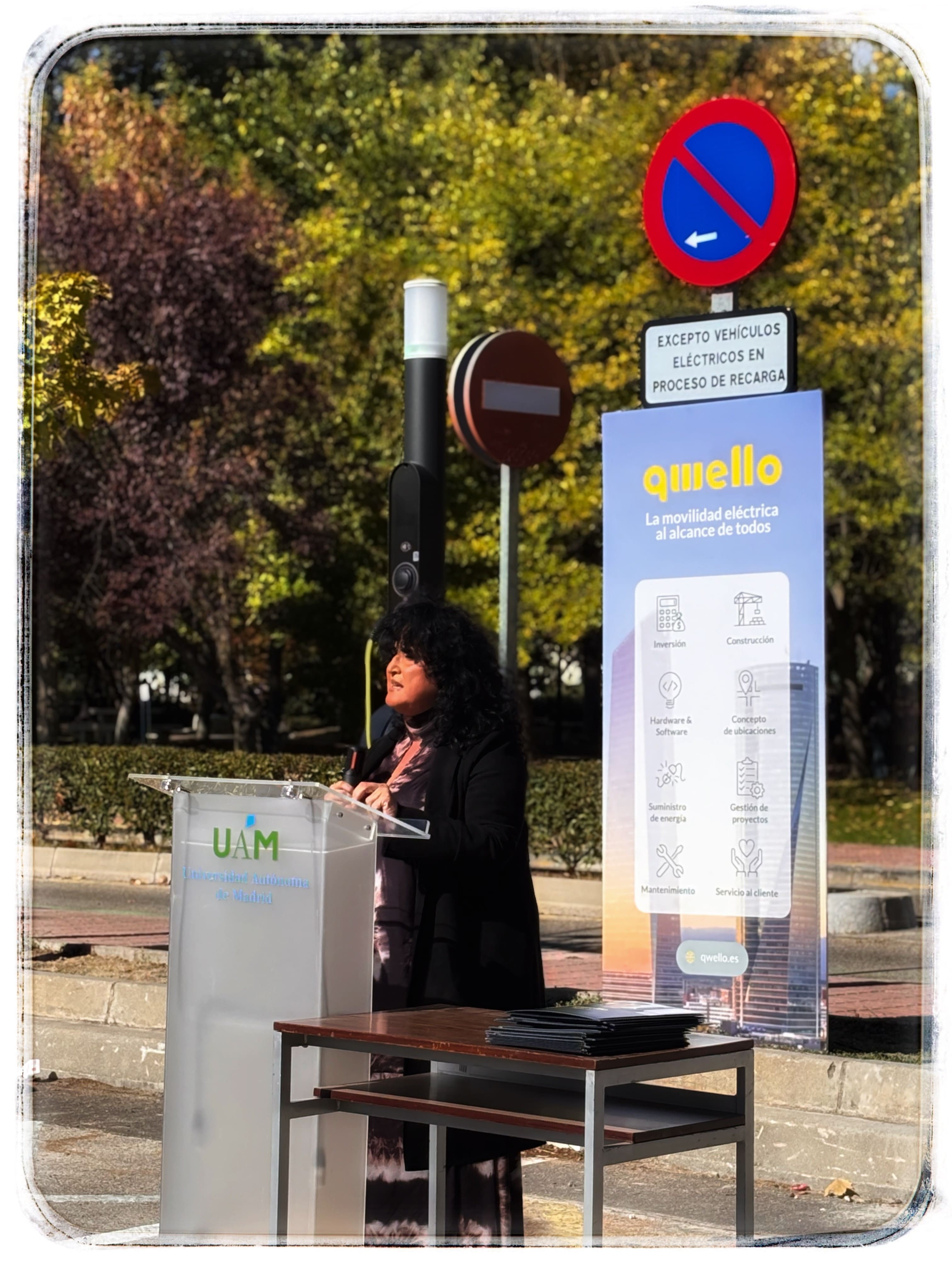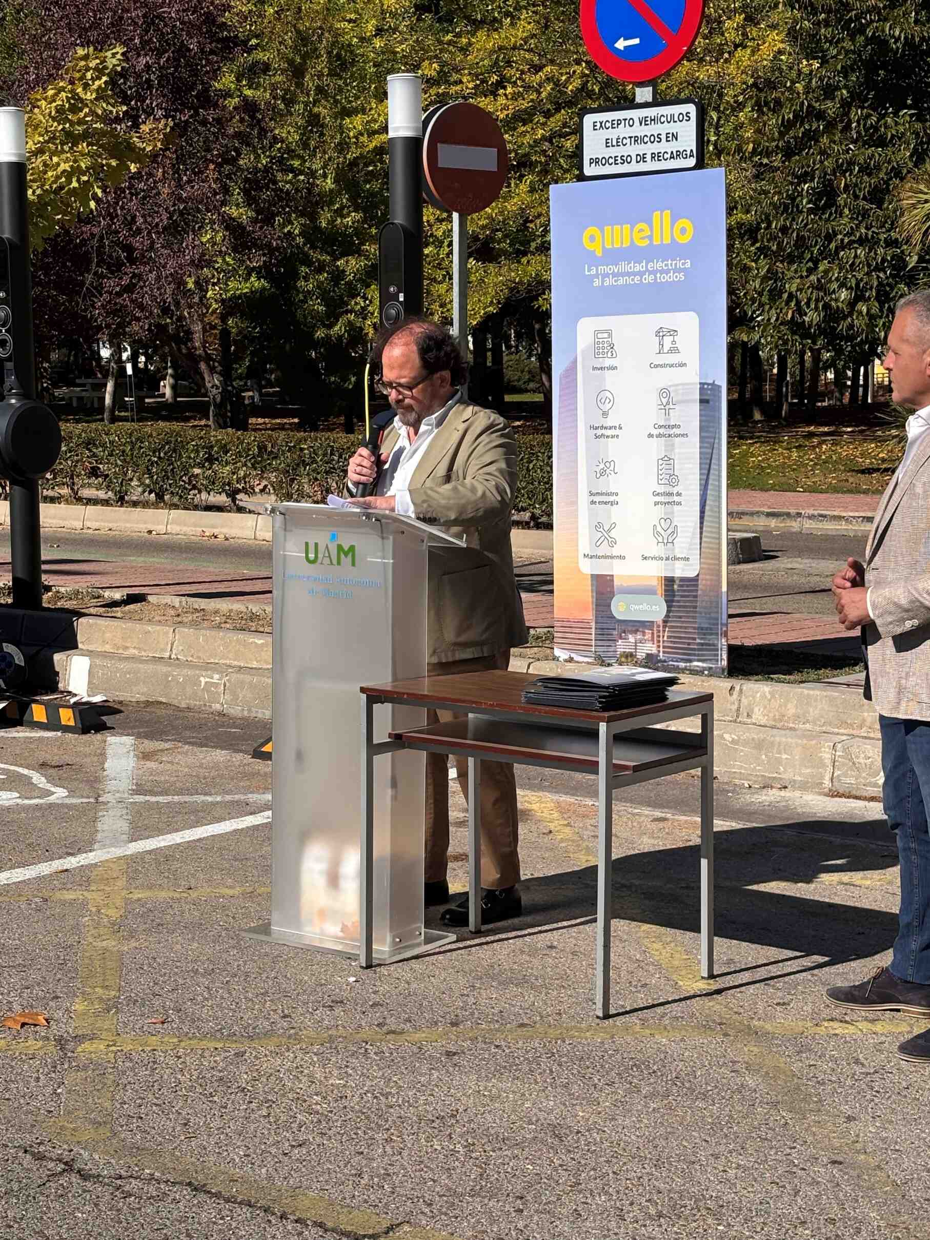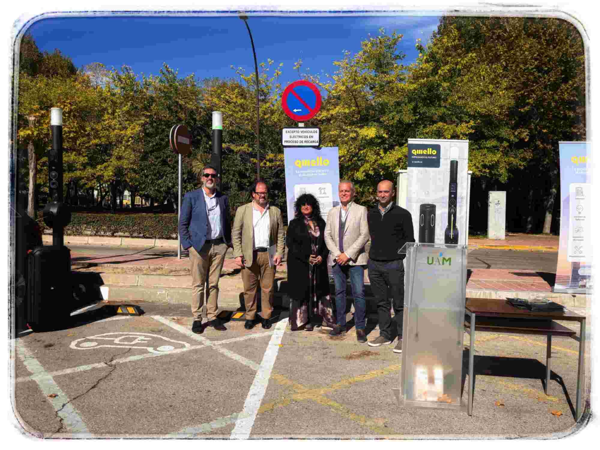 En la mañana del 23 de octubre de 2025 ha tenido lugar, a las 13 horas, en la estación de puntos de recarga de coche eléctrico de la calle Einstein del Campus de Cantoblanco, el acto de presentación oficial del proyecto de la UAM y la empresa Qwello España de instalación a los campus de Cantoblanco y Medicina de un novedoso sistema de recargar de coche eléctrico.