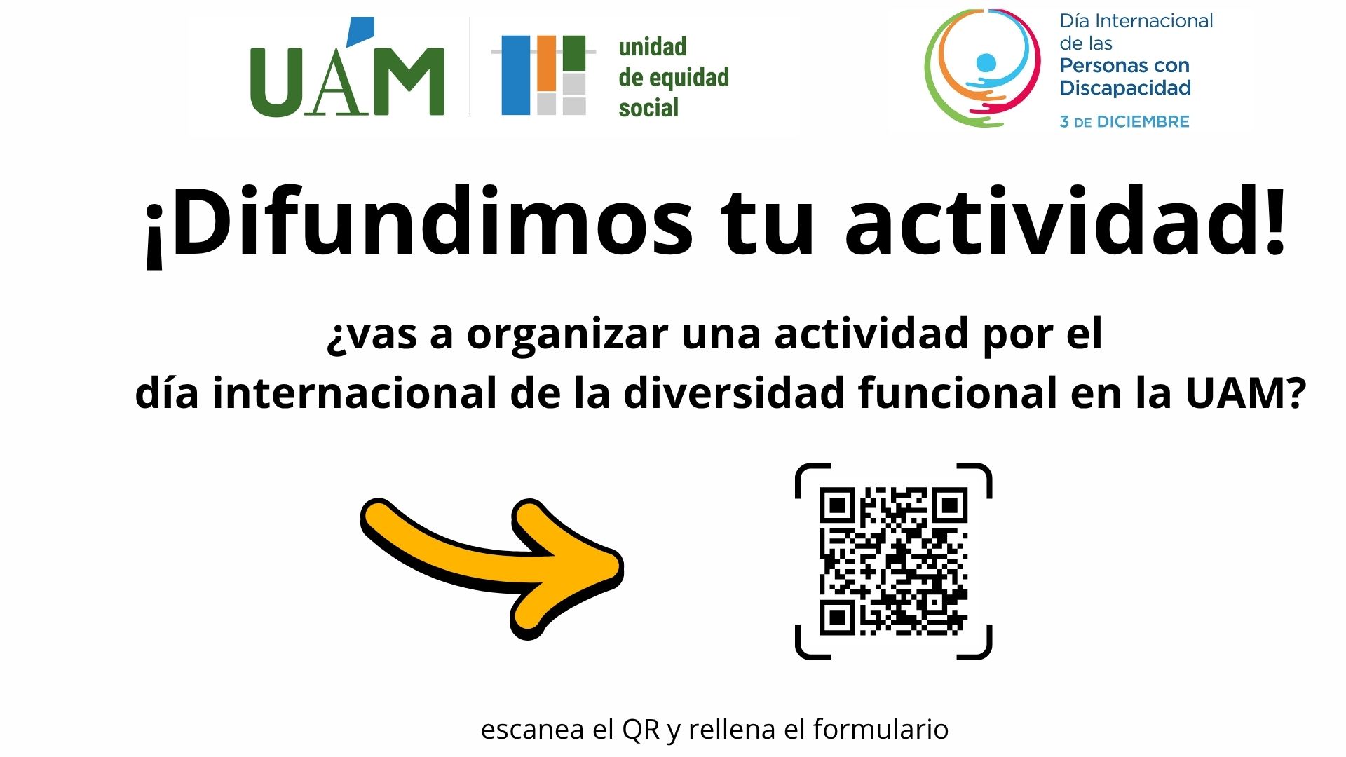 Desde la Unidad de Equidad Social de la UAM estamos recopilando las actividades que se van a celebrar en torno al 3 de diciembre, Día Internacional de la Diversidad Funcional, en el ámbito de la UAM y de los centros del CSIC. En este formulario puedes registrar aquellas actividades que estés organizando o coordinando para que podamos darle difusión institucional.
