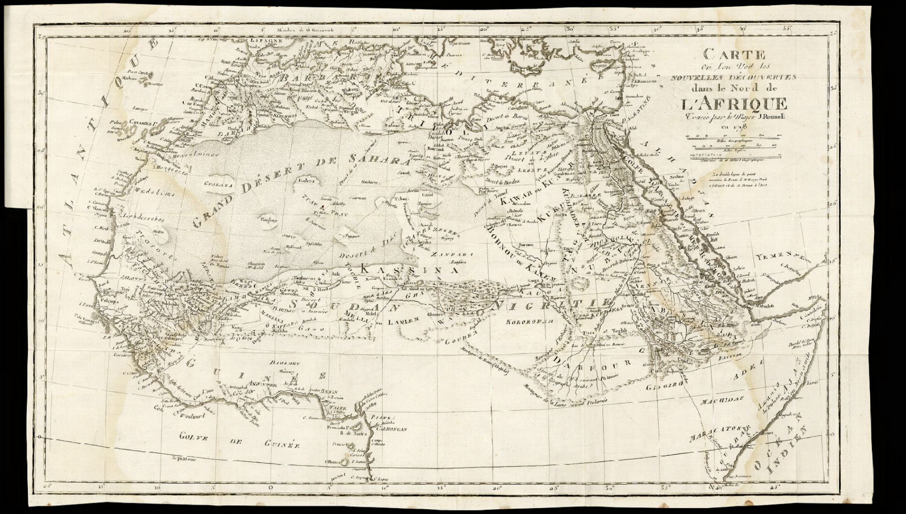 Desplegamos y exponemos el mapa de 75 x 44 cm titulado “Les nouvelles découvertes dans le Nord de l’Afrique” realizado por el cartógrafo James Rennel que recoge los itinerarios de Mungo Park en el Niger y de James Bruce en el Nilo Azul. El trazado del río Niger aguas abajo de Tombuctú – al igual que el del Nilo Blanco – es una mera suposición llevándolo hasta uno de los lagos del interior de África sugeridos por Ptolomeo. La toponimia recoge numerosos nombres de reinos y pueblos africanos de los que se tenía noticia con mayor o menor certeza, trazando sus supuestos límites. Del mismo modo, incluye poblaciones, rutas o caminos, hidrografía, vegetación y otros elementos del paisaje con simbolización convencional sin leyenda al estilo de la cartografía de gabinete.
