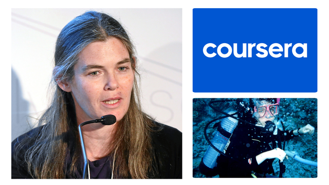 Pie de foto: de izda. a dcha., imagen de Daphne Koller; logo de Coursera; y Koller prioriza su tiempo libre y practica diversas actividades deportivas, como el buceo.